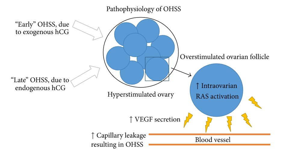 In susceptible patients, the use of hCG for final follicular maturation called trigger injection is the primary stimulus leading to this condition, due to the over-production of VEGF in the ovaries. This over-production of endothelial growth factor increases the permeability of vascular wall leading to loss of fluid in the third space giving rise to all these symptoms and signs.